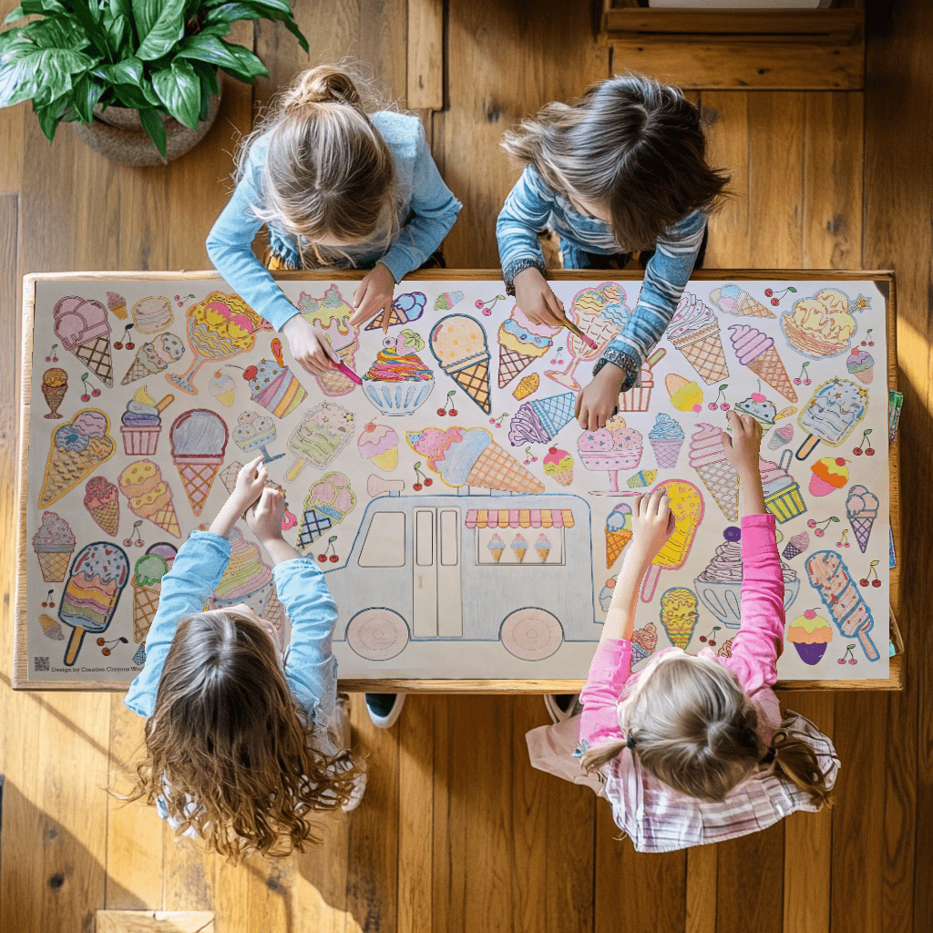 Four children coloring a large ice cream-themed coloring book on a wooden table.