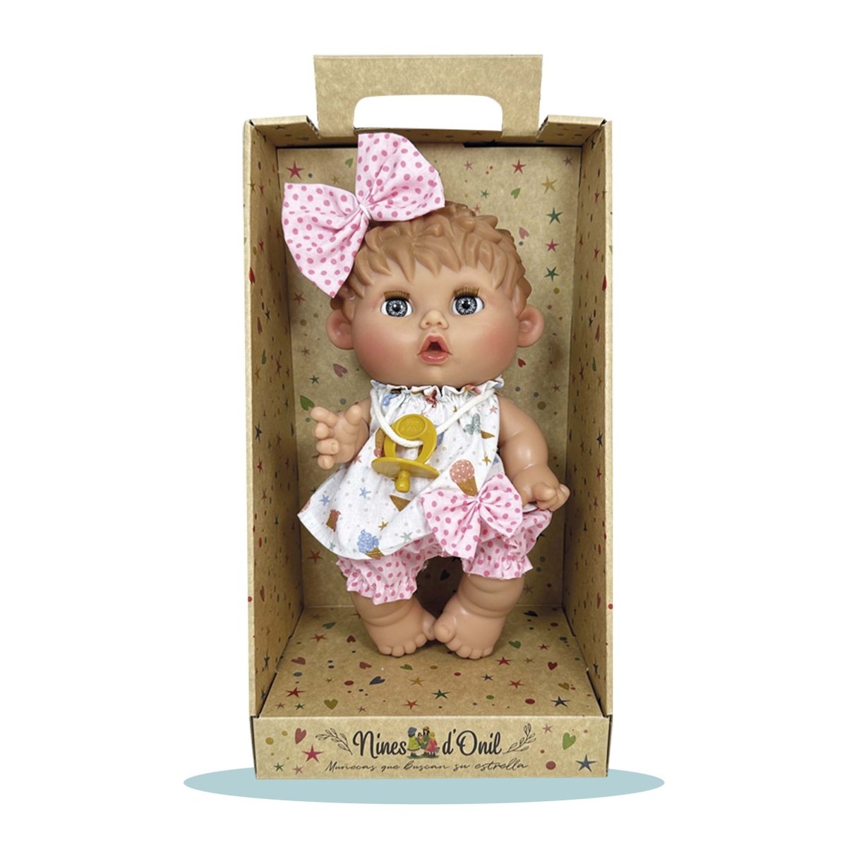 Meet the NEW Popotes an adorable tiny baby doll perfect for tiny hands with eyes that open and close. Nines D'Onil's Popotes mini dolls are 10 inches tall and vanilla-scented. The dolls have a pacifier and are available in different outfits. The dolls are made from a hard body of soft vinyl, so they can go anywhere, even while bathing. They are the perfect first doll for toddlers.
