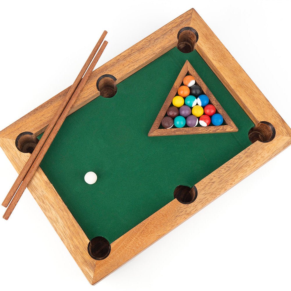 Bring the fun of the billiards hall right into your home with this charming compact pool table! Whether you're a seasoned player or just learning the ropes, this pint-sized game delivers big entertainment. Your set arrives complete with everything needed to start playing: 15 colorful balls, a cue ball, two cue sticks, chalk, and a triangle rack. Perfect for family game nights, friendly competitions, or solo practice sessions. This little table packs serious fun into a space-saving design.