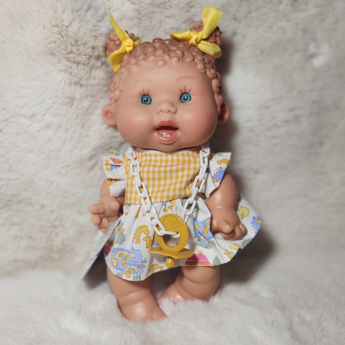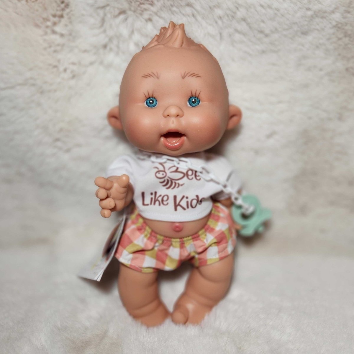 Meet the Pepotes, an adorable tiny baby doll perfect for tiny hands. Nines D'Onil's Pepotes Original mini dolls are 10 inches tall and vanilla-scented. The dolls have a pacifier and are available in different outfits. The dolls are made from a hard body of soft vinyl, so they can go anywhere, even while bathing. They are the perfect first doll for toddlers.