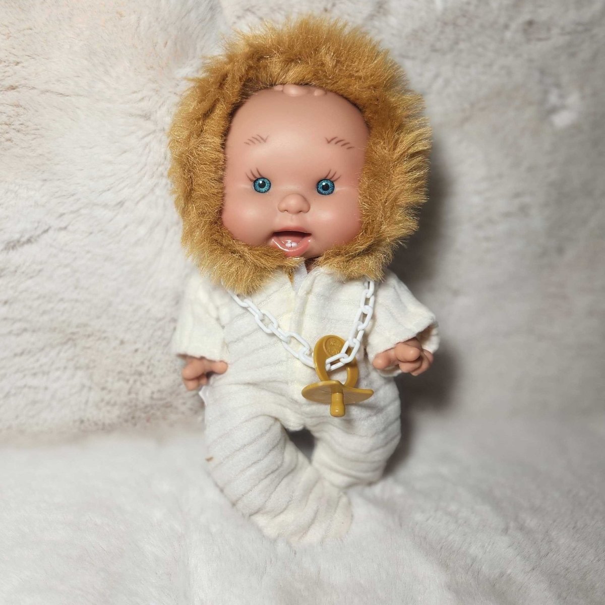 Very beautiful little doll. She is perfect and easy to travel with. I am very satisfied and happy. Thank you so much.