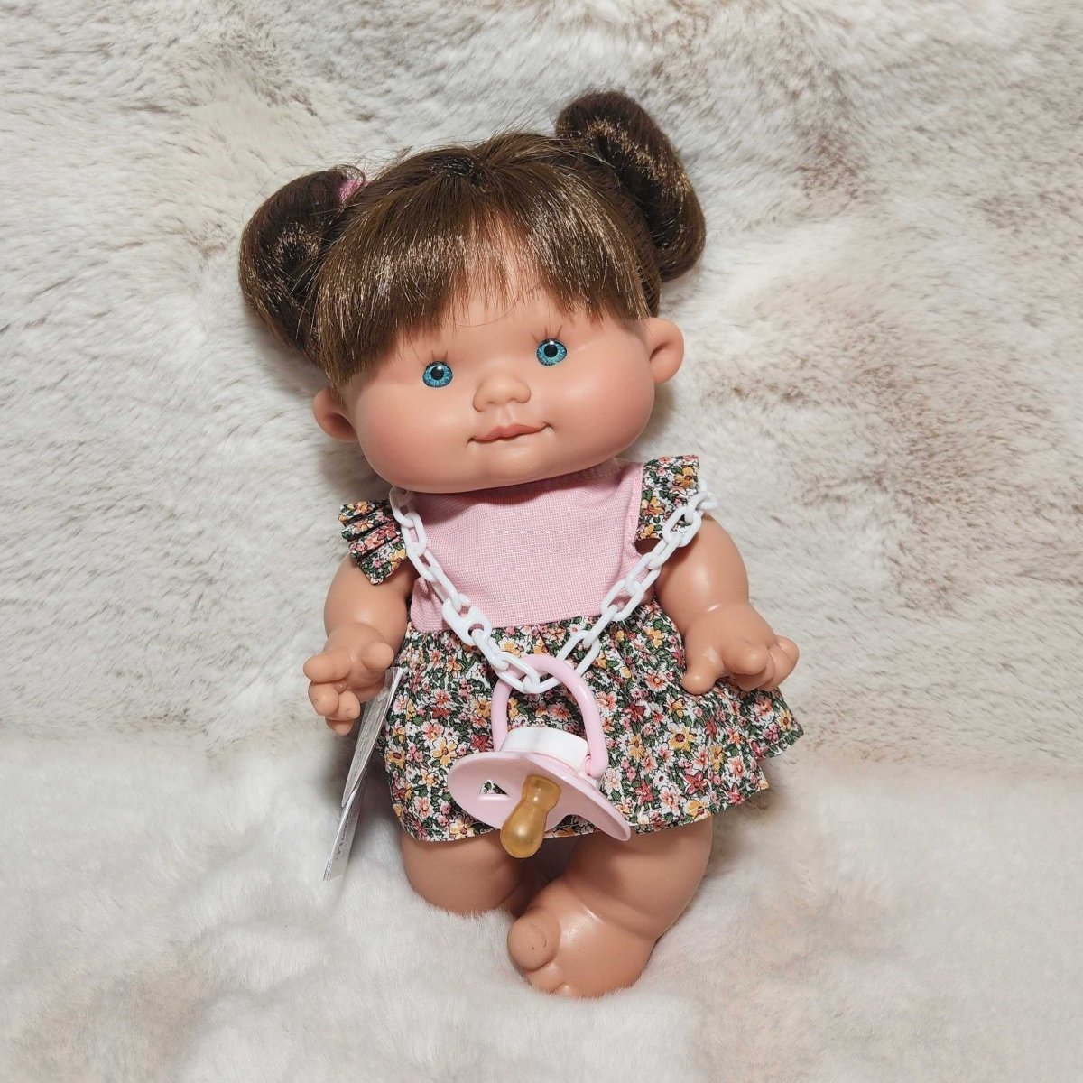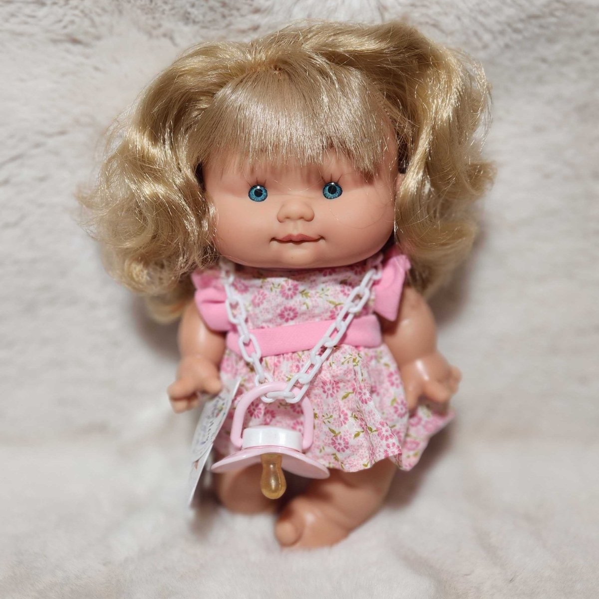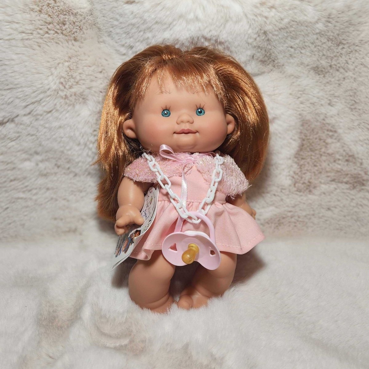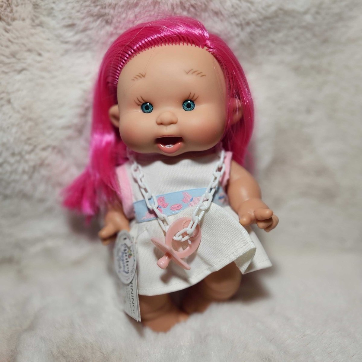 Say hello to our new friends. The Pepotes are adorable tiny baby dolls perfect for tiny hands. Nines D'Onil's Pepotes Special mini dolls are 9 inches tall and vanilla scented. The dolls have a pacifier and are available in different outfits. The dolls are made from a hard body of soft vinyl, so they can go anywhere, even while bathing. They are the perfect fist doll for toddlers.