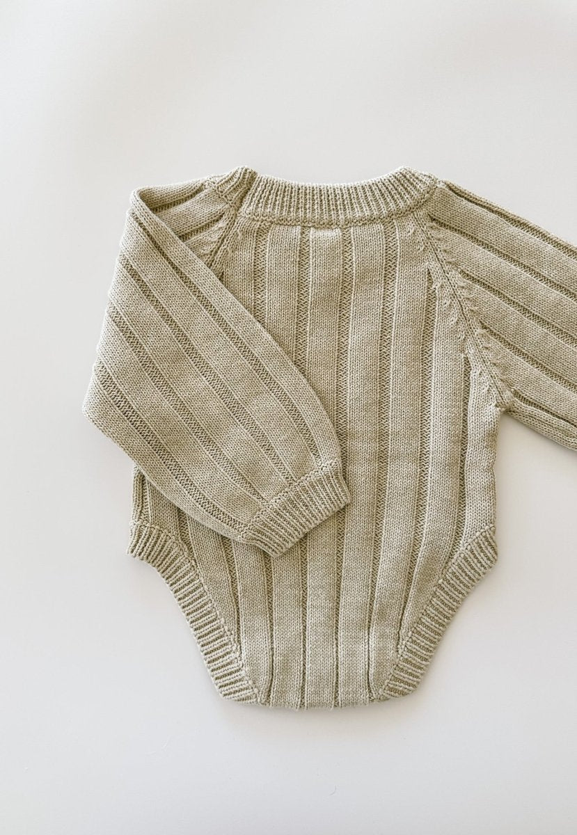 This piece features a marled look using a deep beige knit together with a taupe color. Our new wide ribbed knit onesie is the perfect piece for your babies wardrobe. A timeless style and high-quality pima knit cotton, this onesie will be with you for as long as you need it. This heirloom piece was designed with a thick knit collar and leg openings to ensure comfort and durability. Invisible snap buttons on the crotch provide for easy outfit and diaper changes.