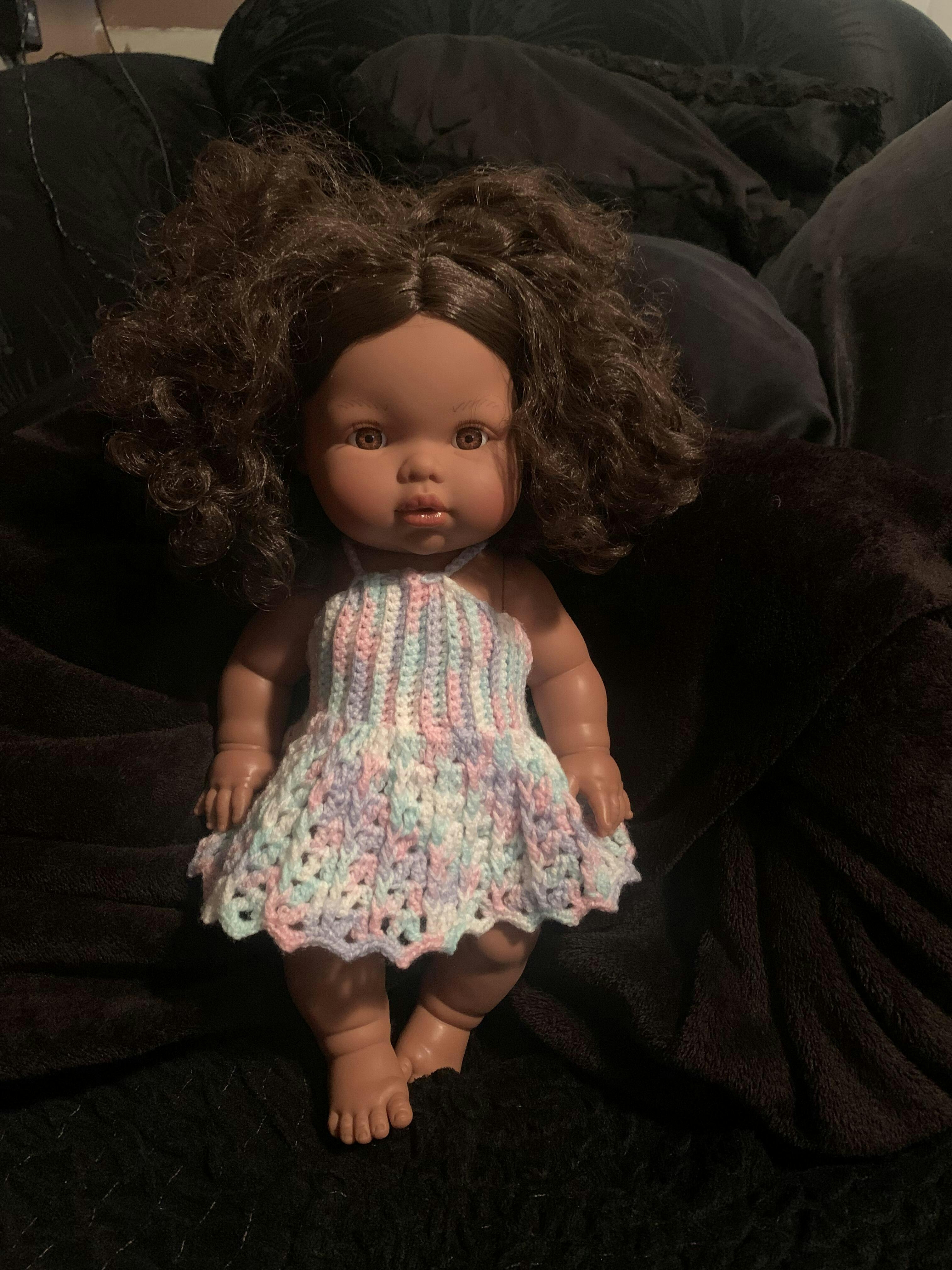Zaara is a Hispanic baby girl doll with curly brown hair and brown eyes. The Mini Colettos is a diverse line of anatomically correct 13" dolls made in Spain in the Valencian town of Onil, using the highest quality materials from eco-friendly and non-toxic vinyl.
