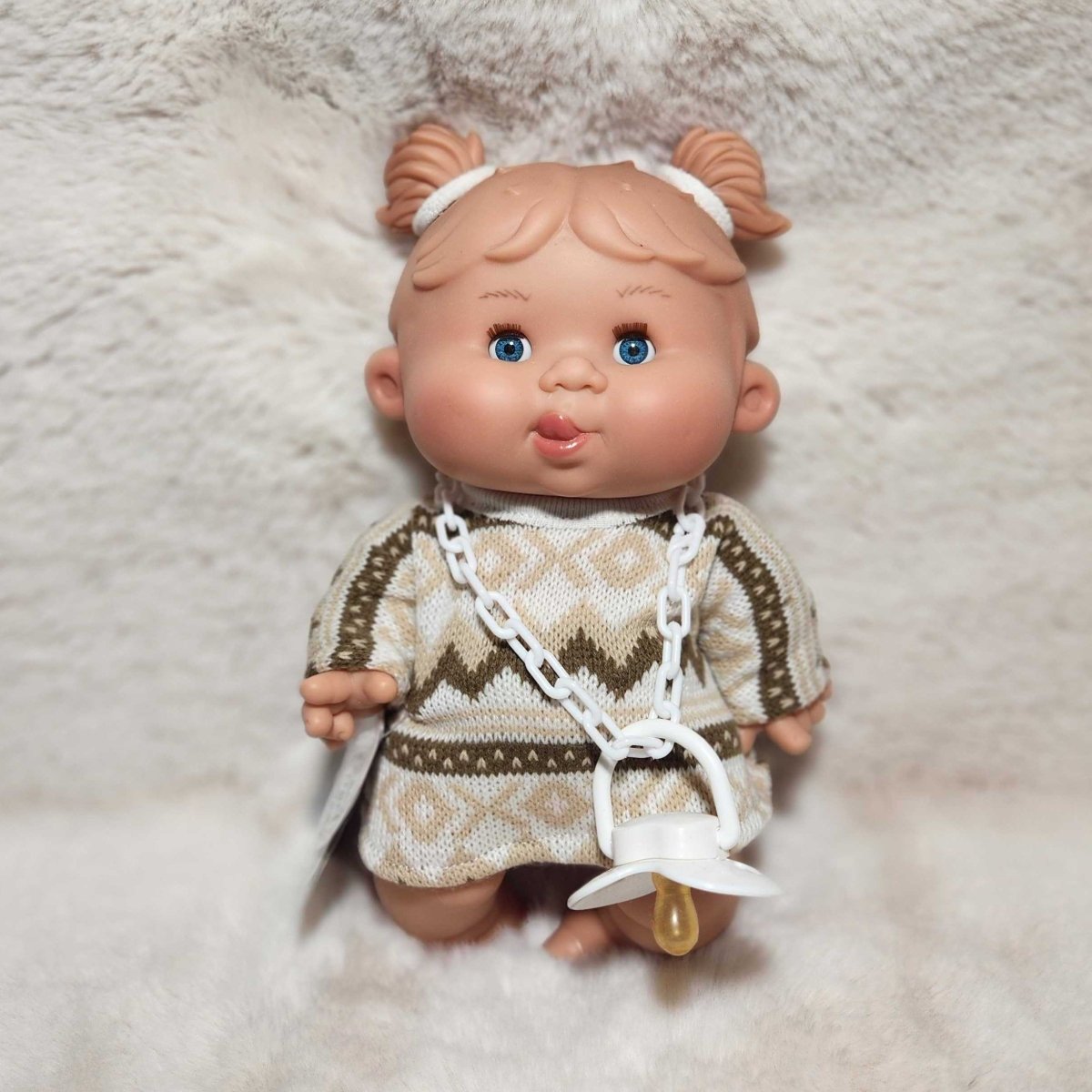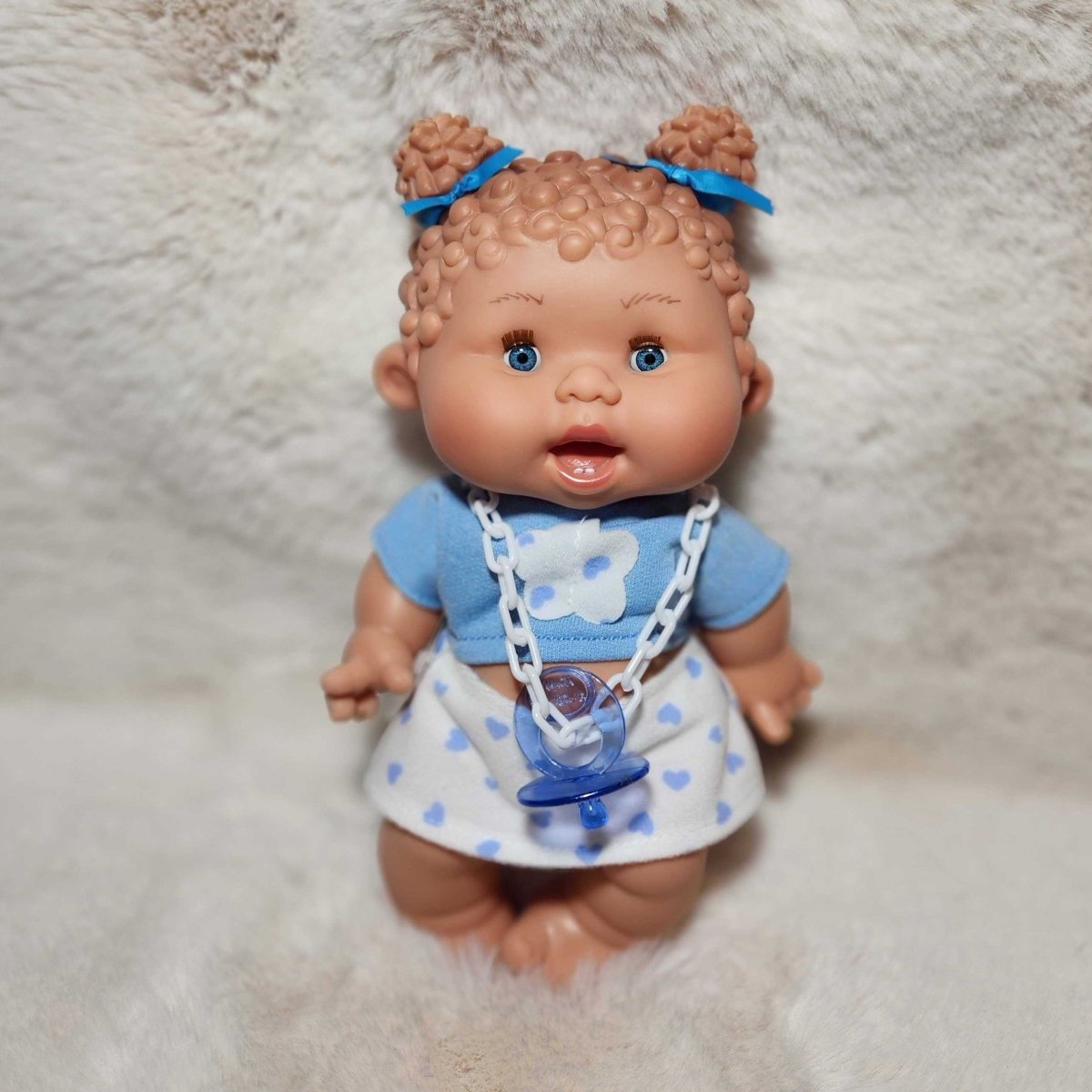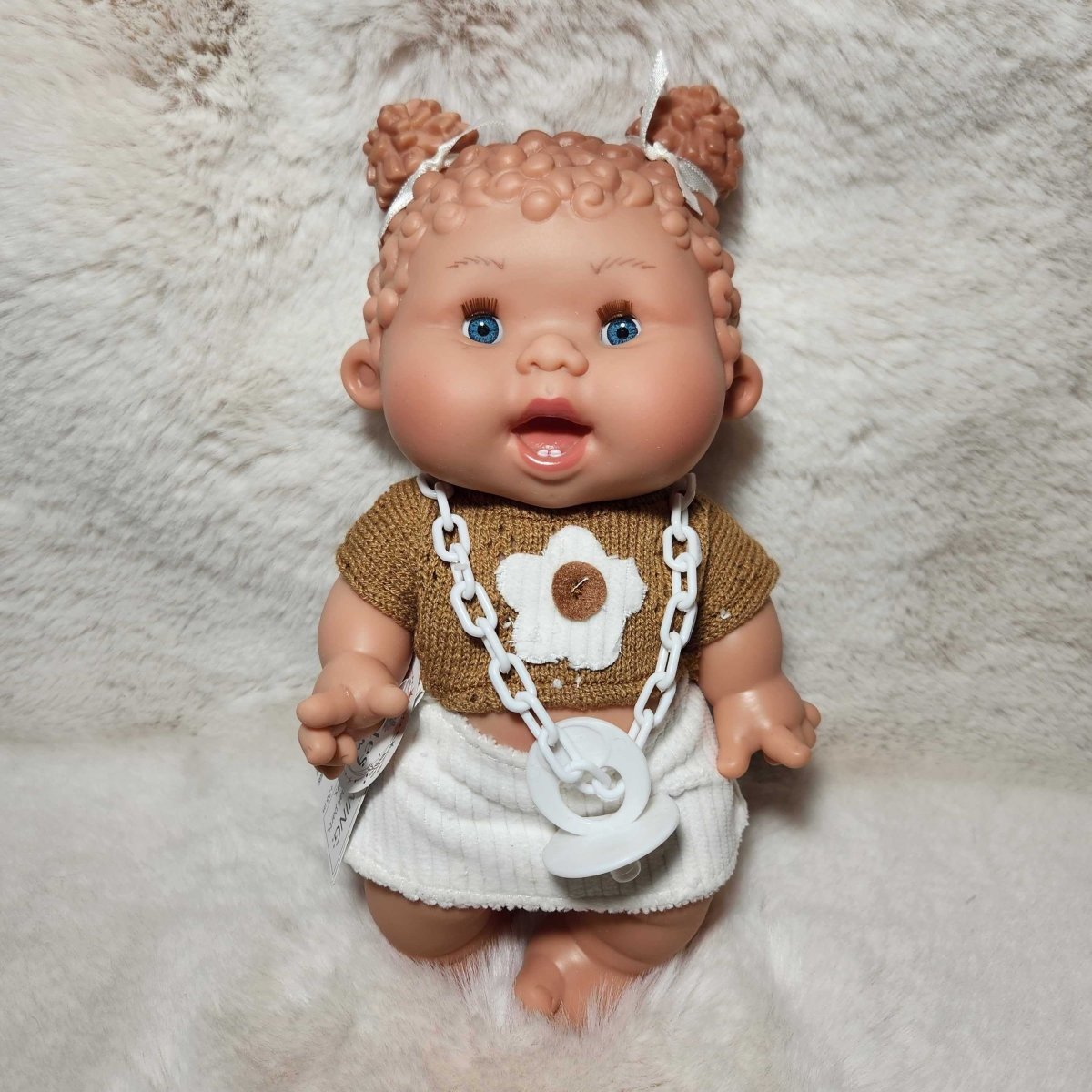 Baby doll with blonde hair and blue eyes wearing a brown top and white skirt on a fluffy white surface.