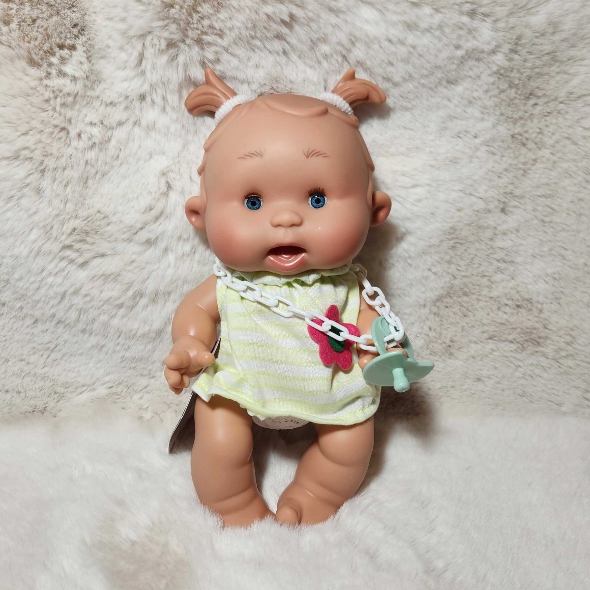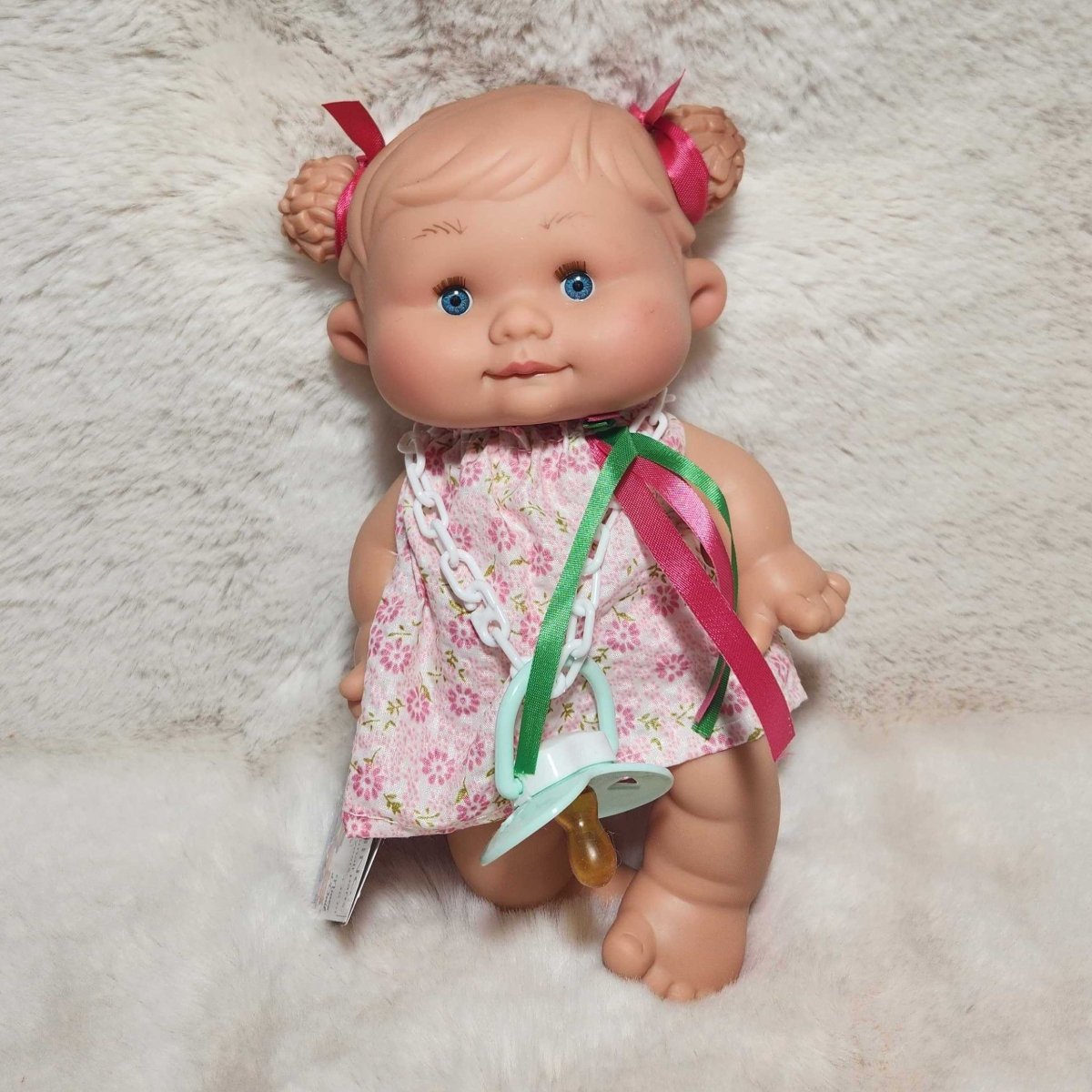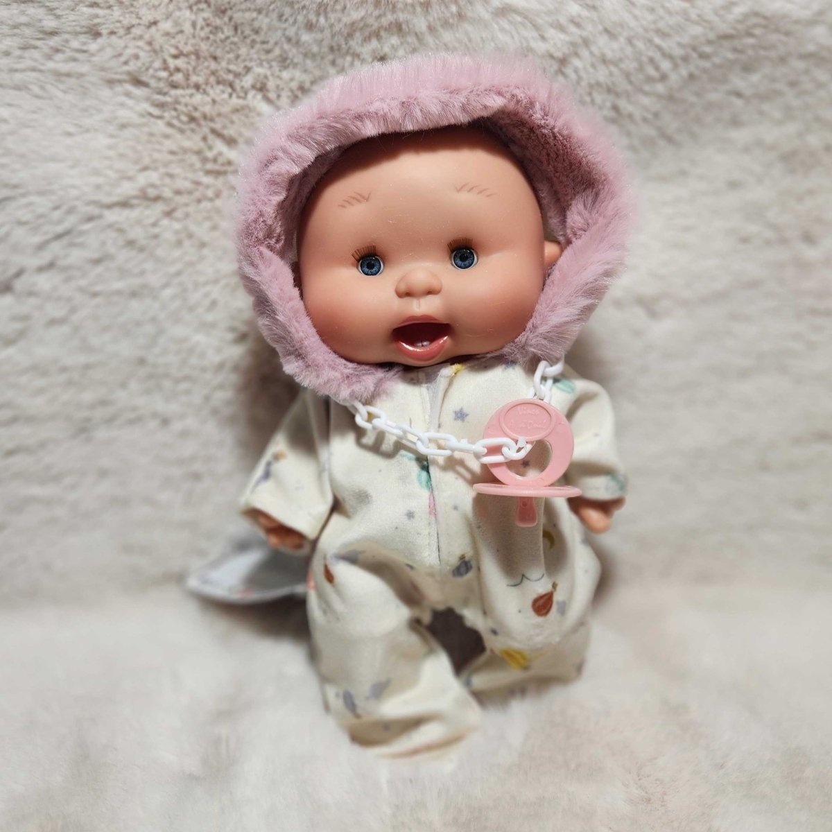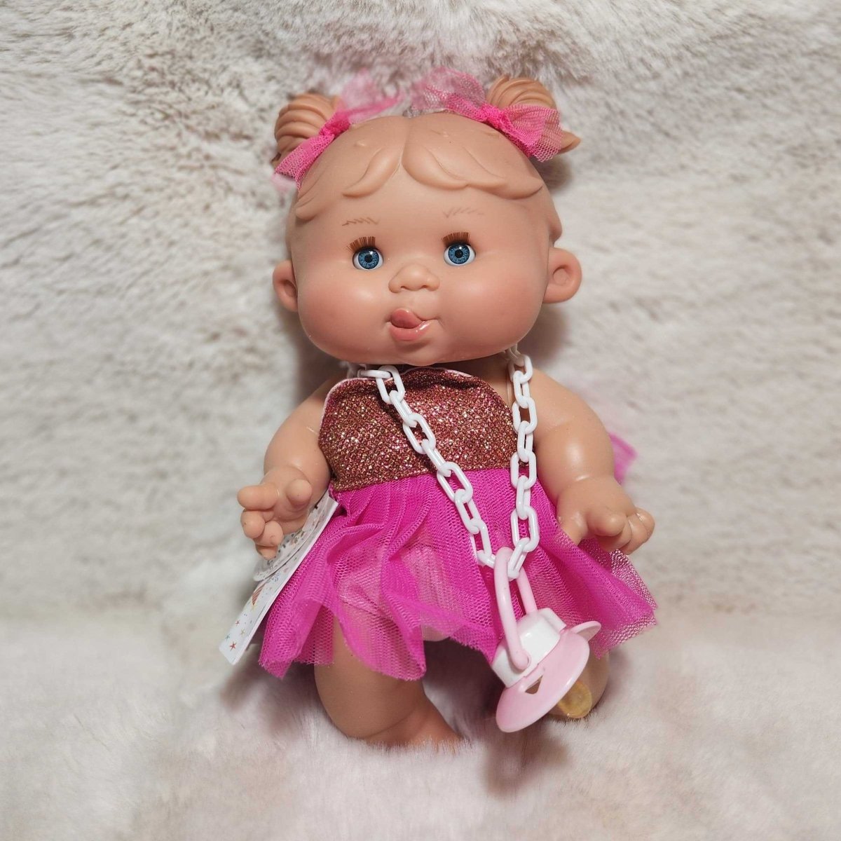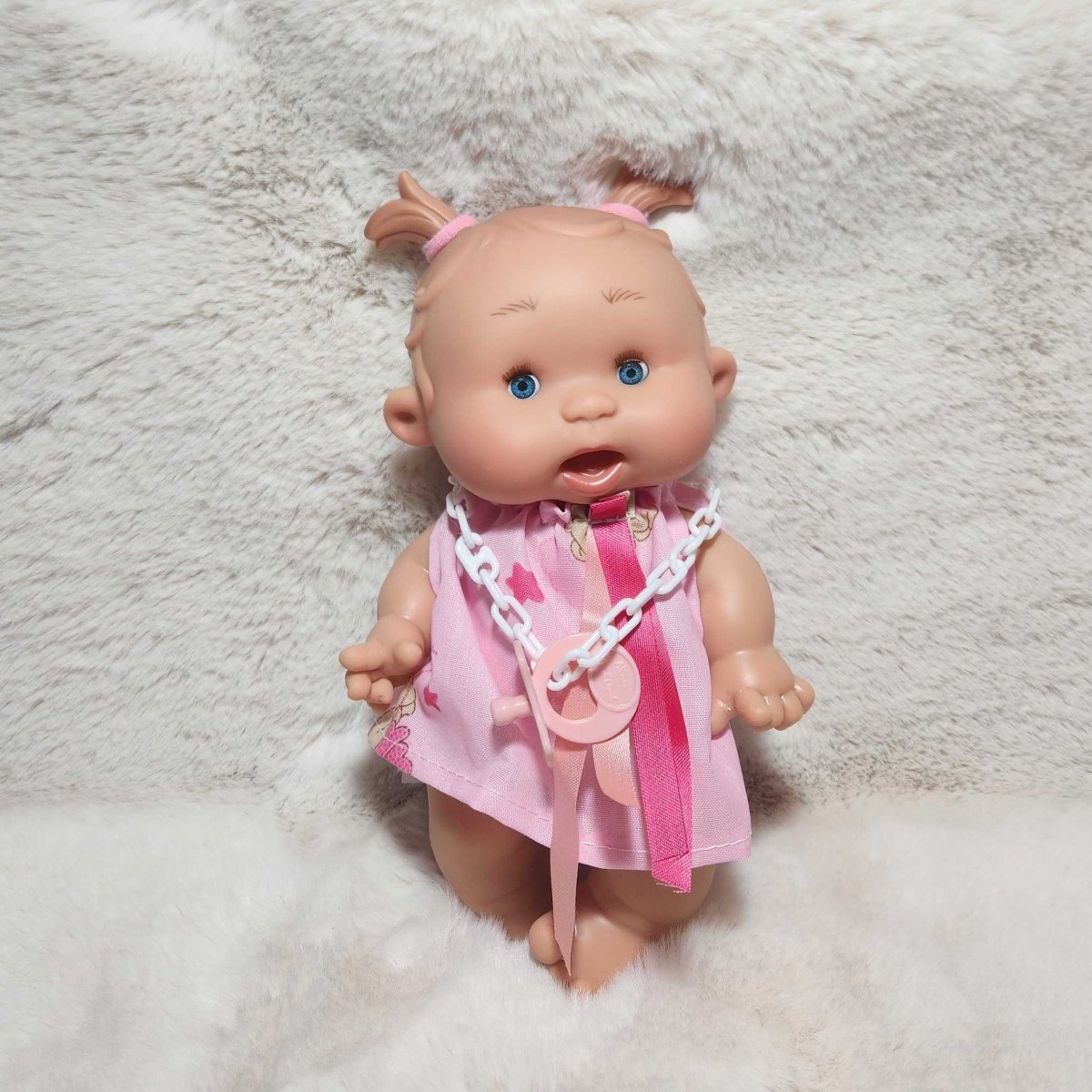Small doll with a pink outfit and pacifier on a textured white surface