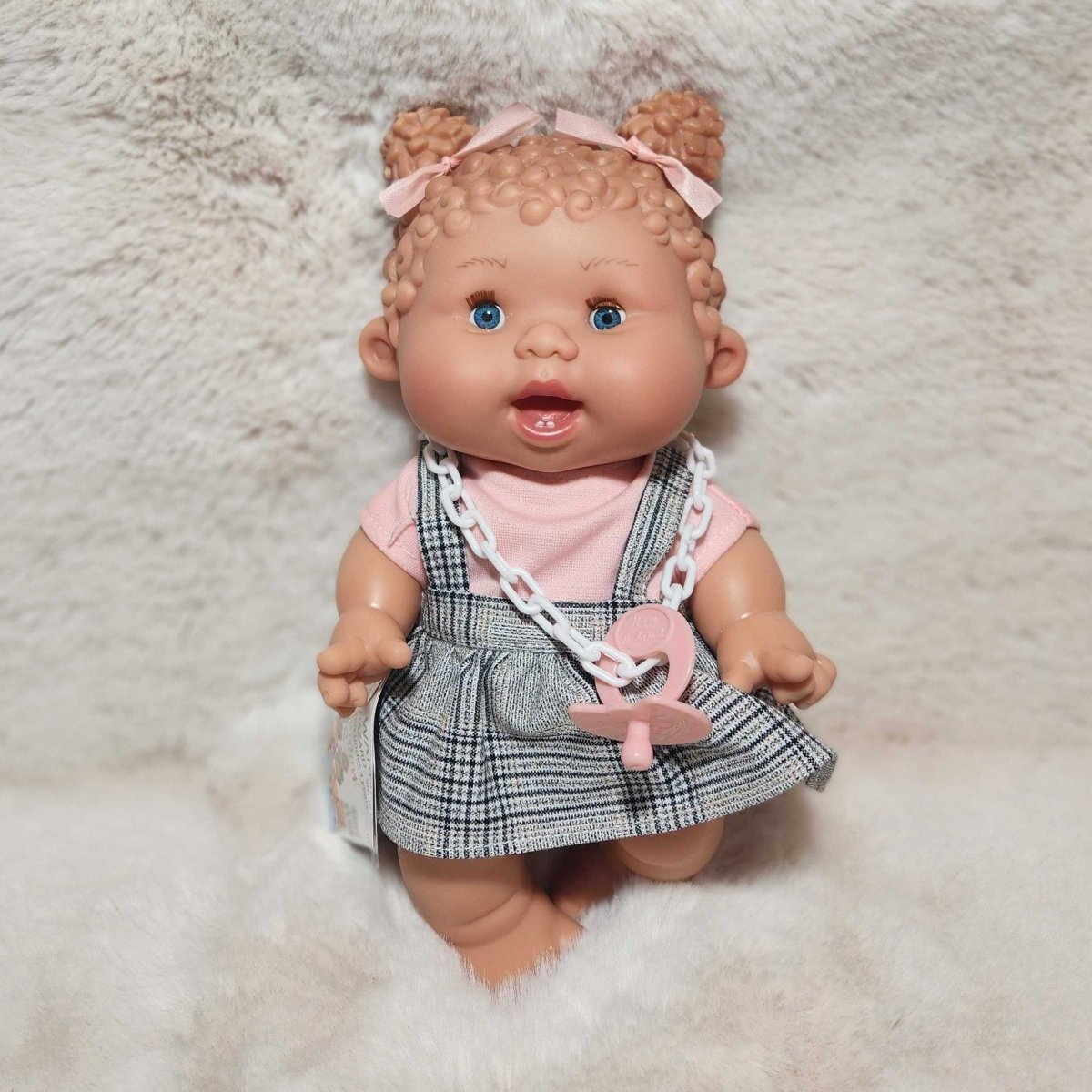 Small doll with blonde hair and a checkered dress sitting on a fluffy white surface.