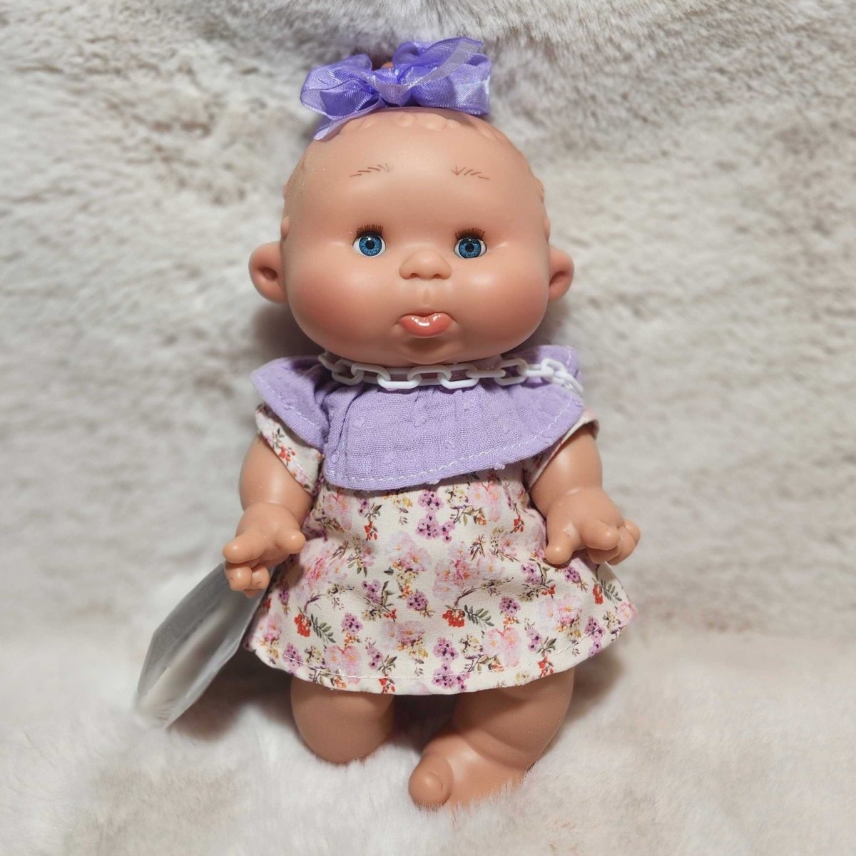 Baby doll with a floral dress and purple top on a white fluffy surface