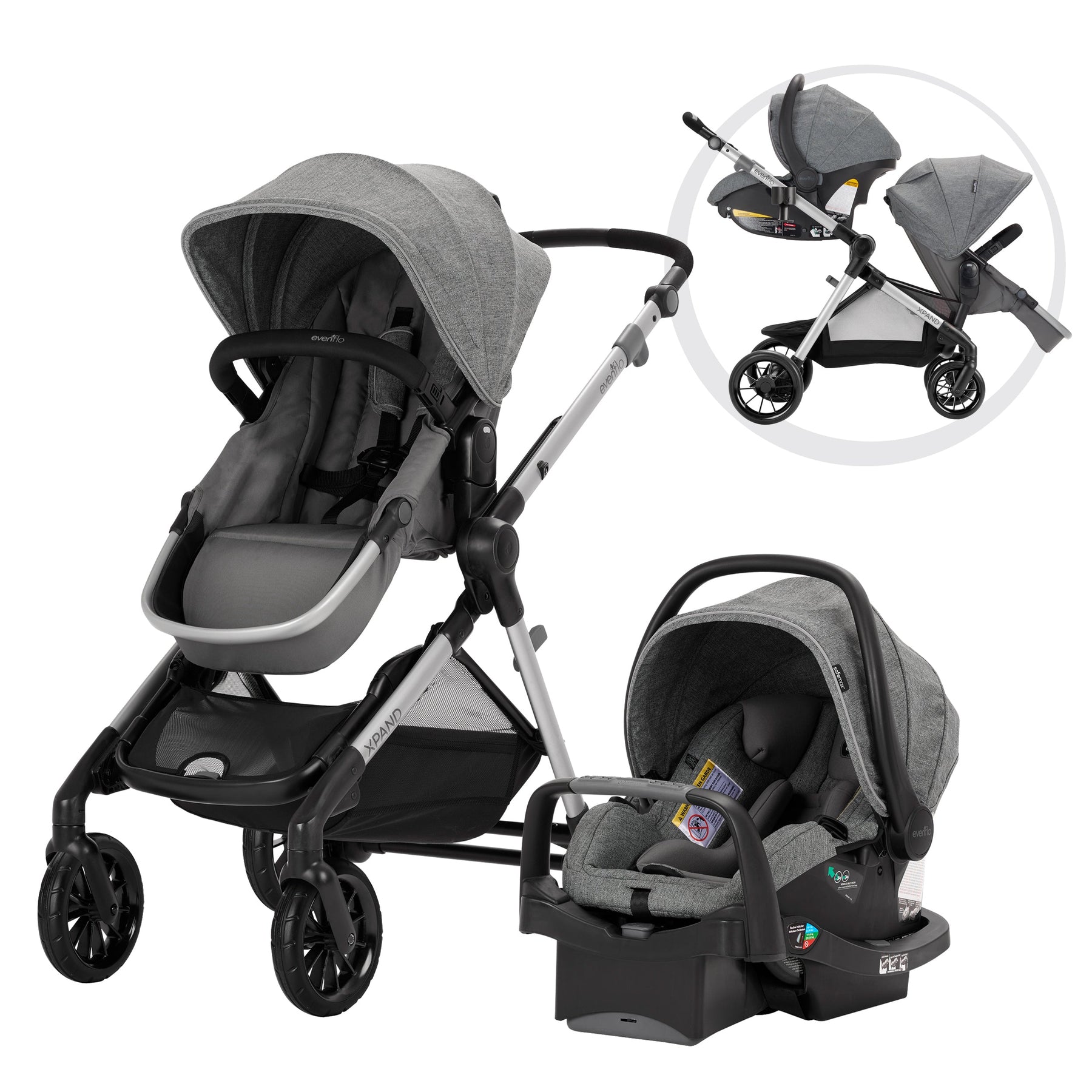 Meet the Evenflo Gold Pivot Xpand! This award-winning travel system seamlessly transforms from single to double in seconds, without tools or extra parts. It's perfect for busy parents who want a stylish and convenient way to get around with their little ones.