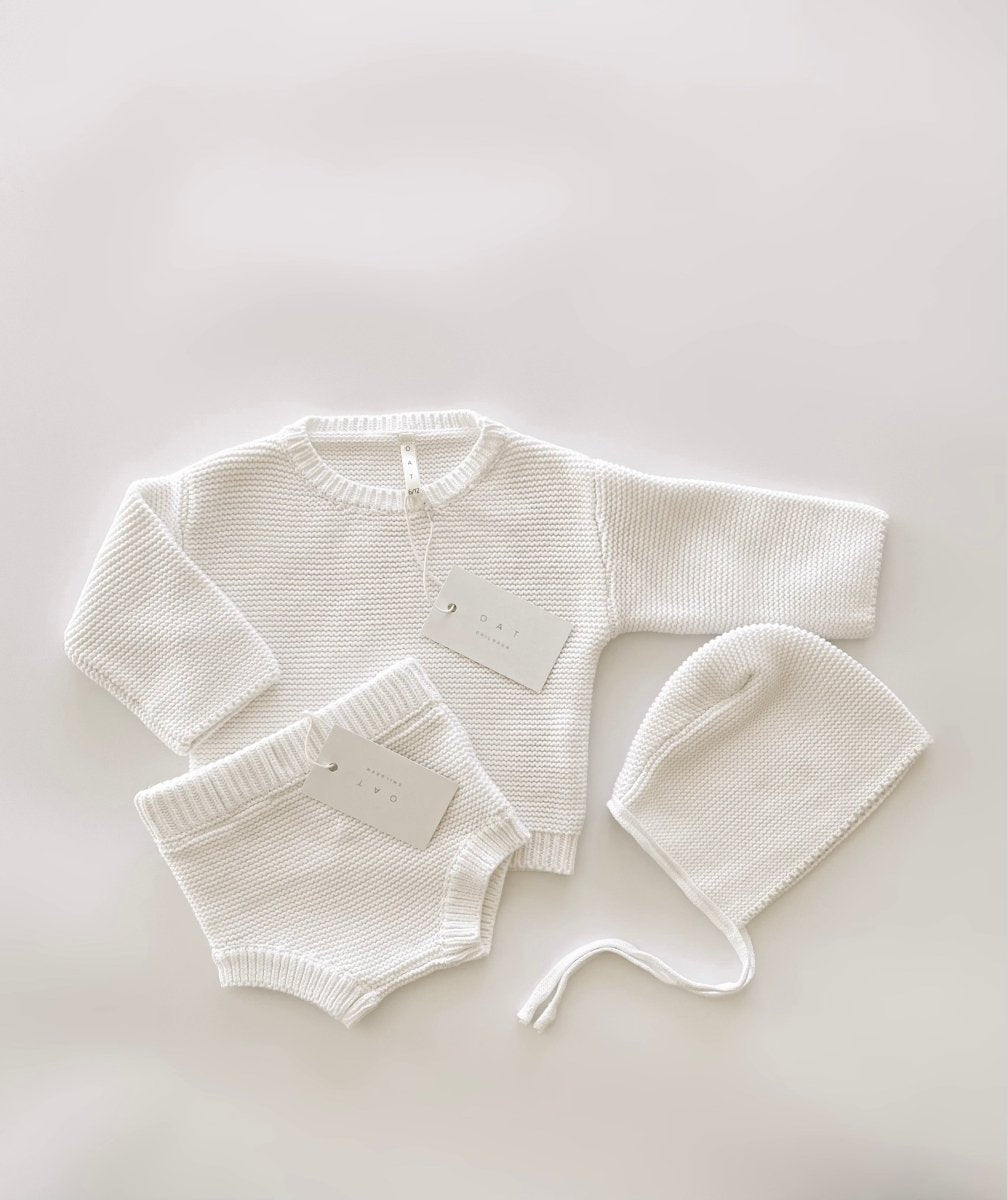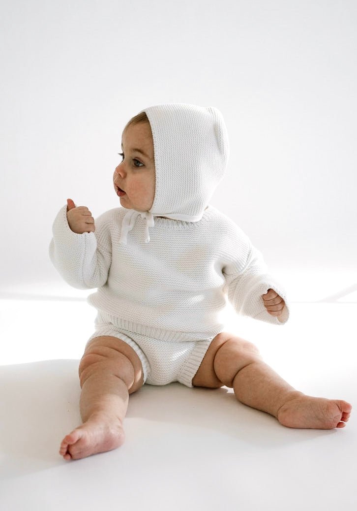 The Purl Stitch Bonnet "Milk"is a baby wardrobe must have. Perfect for every season and made with 100% high quality cotton, this piece is going to become an everyday favorite. Our popular purl knit design gives it  a durable feel while being breathable and lightweight. Pair with the purl knit sweater and matching bloomer for the full set.