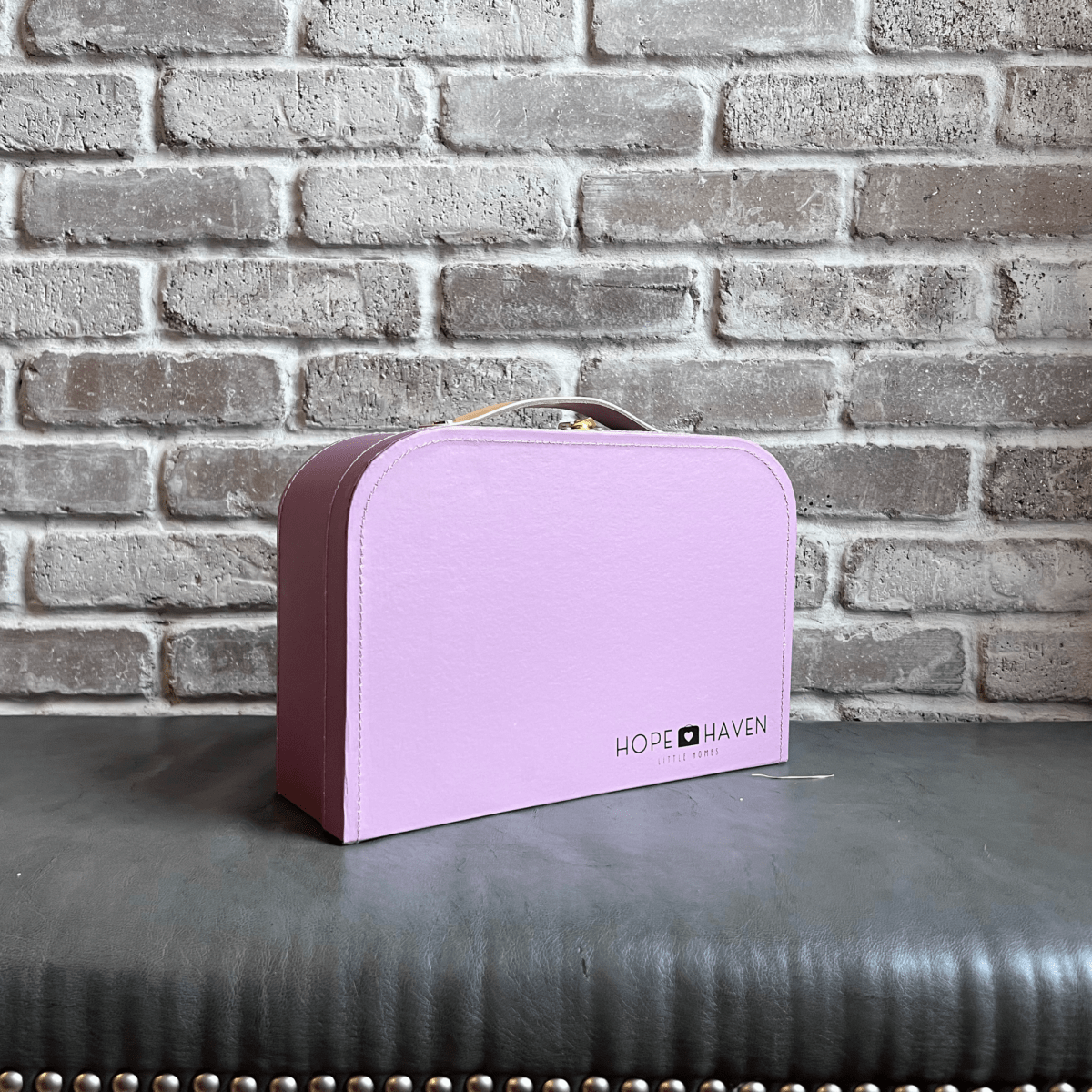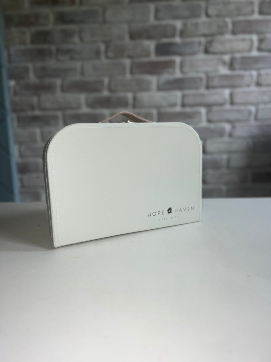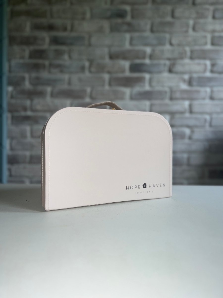 The Hope Haven Little Home - Lunchbox Style Dollhouse with Leather Handle, Magnetic side and back wall, and wood printed flooring. Roughly 12 in. x 8 in. x 4 in.