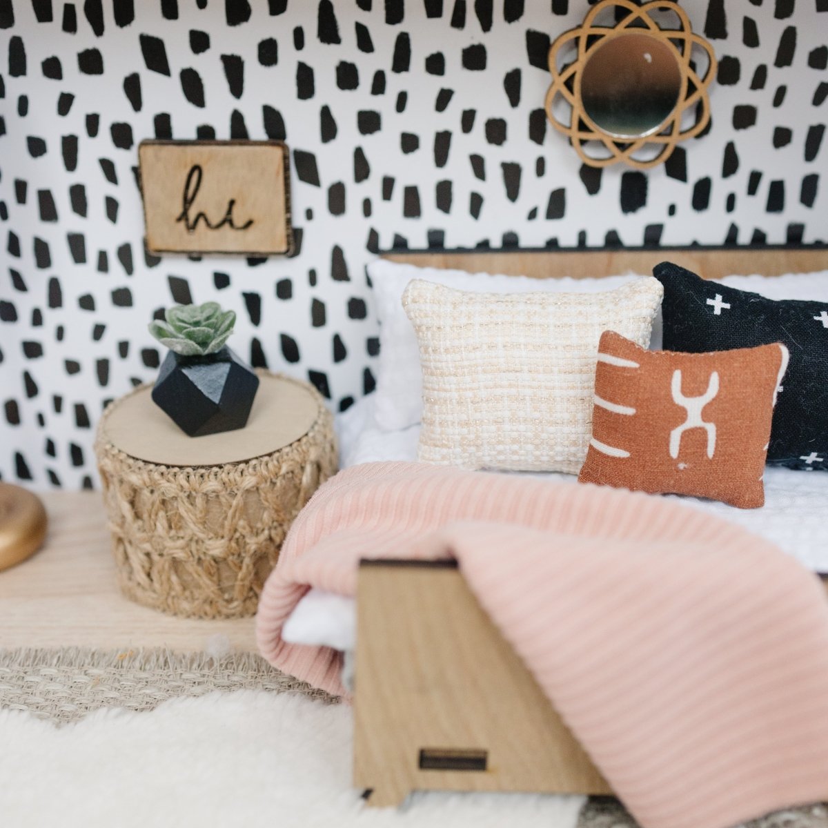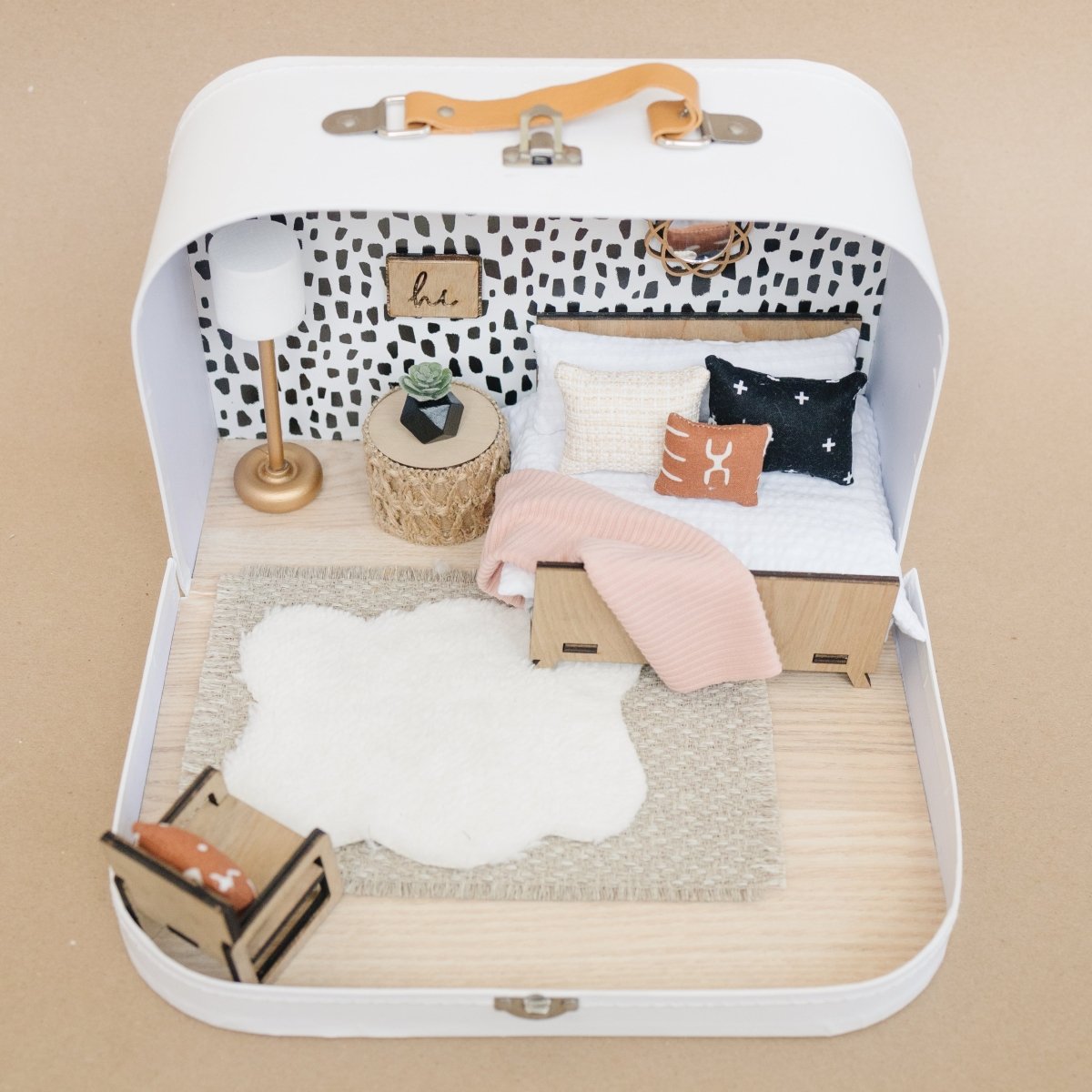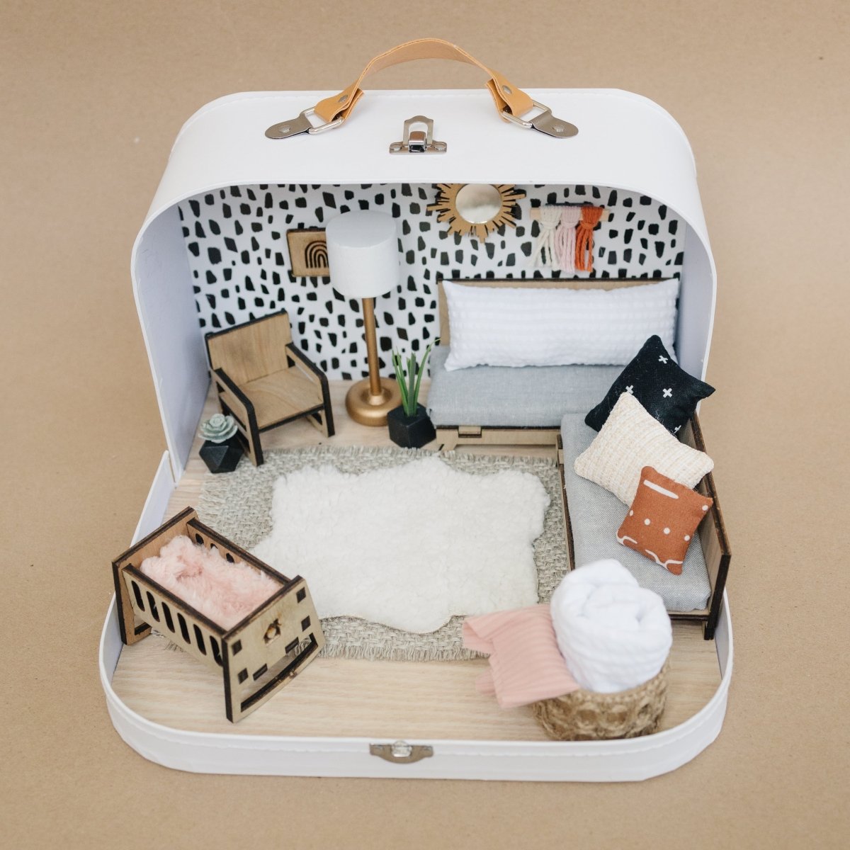 The Hope Haven Little Home - Lunchbox Style Dollhouse with Leather Handle, Magnetic side and back wall, and wood printed flooring. Roughly 12 in. x 8 in. x 4 in.